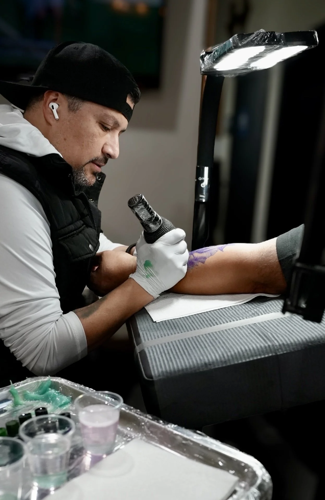 In 2009, Saul was gifted a tattoo kit by his cousin, who recognized his artistic talents and encouraged him to apply it to tattooing. After his first attempt, he was immediately captivated by the new medium and embarked on his tattooing journey.